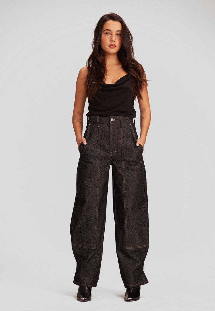 Franklyn is an ultra high rise trouser that sits easy at the hips and thigh, with utility patch pockets and contrast top stitching. An ankle tab cinches the silhouette from an easy straight leg to a barrel.