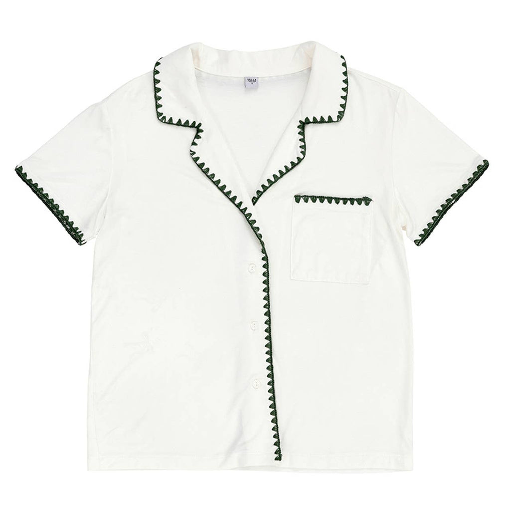 Short Bamboo PJ Set - White + Forest Green Whip Stitch: 93% Bamboo/ 7% Spandex / Medium